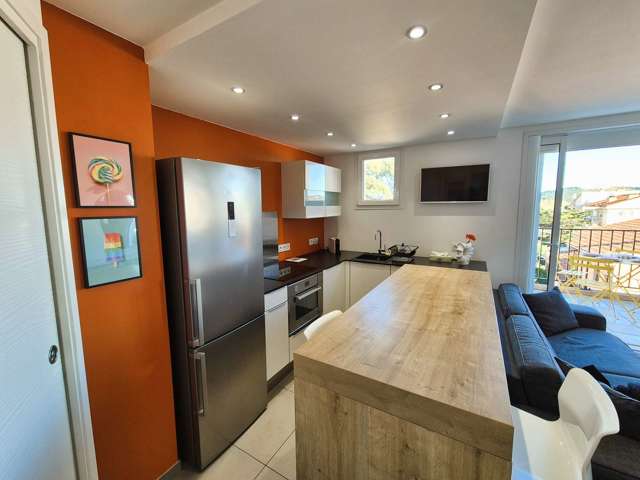 Le séjour est lumineux, avec un canapé convertible, un coin cuisine équipé, une salle d'eau avec douche italienne et des toilettes suspendus. Vous pourrez également profiter d'une grande terrasse de 8m² aménagée avec un salon de jardin, offrant une vue dégagée et un aperçu sur la mer.