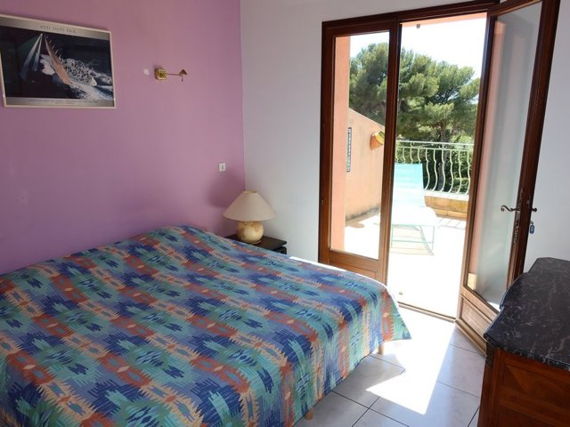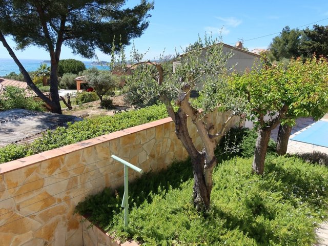 A sensiblement égale distance des ports de Sanary et Bandol, belle villa rénovée avec 3 chambres, climatisée, avec belle piscine, parking, terrasses et vue mer.