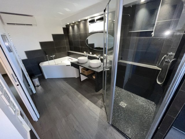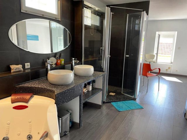 Grande suite parentale climatisée avec lit double en 160, douche à l'italienne, baignoire balnéo, double lavabo puis sur le même palier et côté Nord un dressing puis un wc indépendant avec lave-mains.