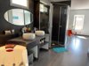 Une grande pièce à usage de salle à manger climatisée + cuisine ouverte entièrement équipée.