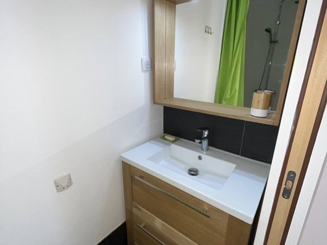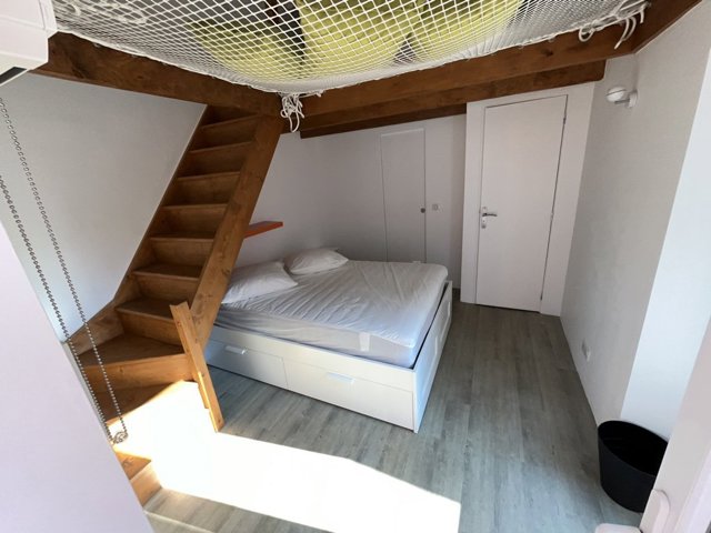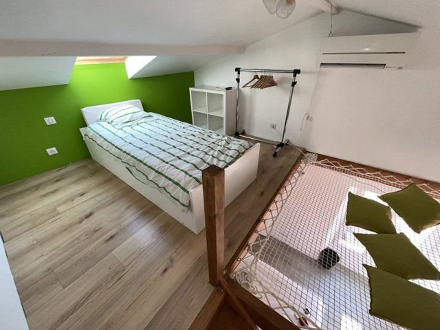 Grande chambre climatisée en sous-pente avec lit double en 140, une douche cabine, lavabo, wc indépendant.