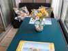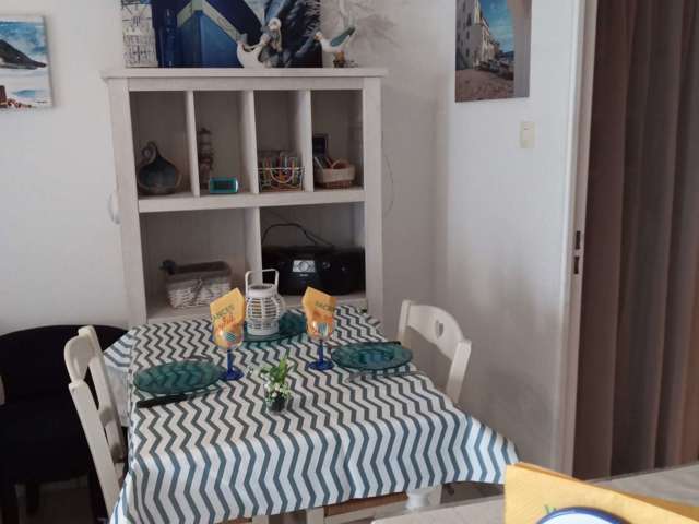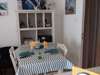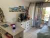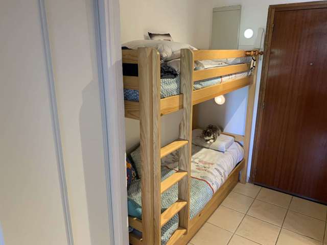 Appartement avec cuisine ouverte sur le séjour avec un lit en 140 cm, un coin nuit avec 2 lits superposés, une salle de bain avec WC, une loggia ouverte avec un salon de jardin.