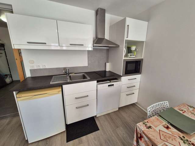 Appartement de 37 m², composé d'une cuisine toute équipée ouverte sur un joli séjour, d'une salle de bains avec douche à l'italienne et wc, d'une chambre avec un lit superposé, et d'une grande terrasse de 20 m².