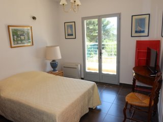 A sensiblement égale distance des ports de Sanary et Bandol, belle villa rénovée avec 3 chambres, climatisée, avec belle piscine, parking, terrasses et vue mer.