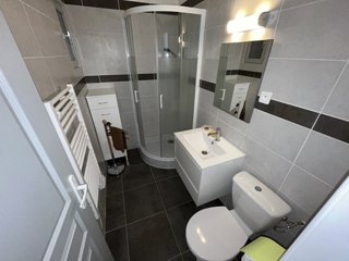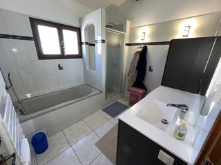 A l'étage, un petit salon avec bibliothèque, 2 chambres (l'une avec lit double en 140 et l'autre avec 2 lits simples en 90 identiques et donc modulables), une grande salle de bains avec baignoire + douche, un wc indépendant.